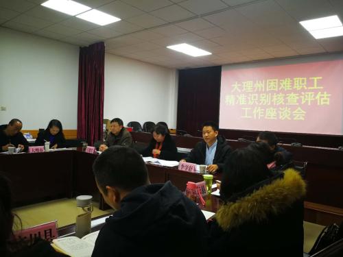 会议由大理州总工会王副主席主持,三个县工会和三个州属产业工会对本单位目前困难职工帮困脱困工作进行汇报。州总工会李迎春主席对大理州困难职工帮困脱困工作开展情况作了发言,指出解困脱困工作是由政府搭台、工会主导、基层配合的一项工作,需要各层级相互配合、齐抓共管,她对目前解困脱困工作指出存在四个方面的不足,对下一步解脱困工作提出五个要求,李学舒组长对精准识别核查评估工作作了宣讲。