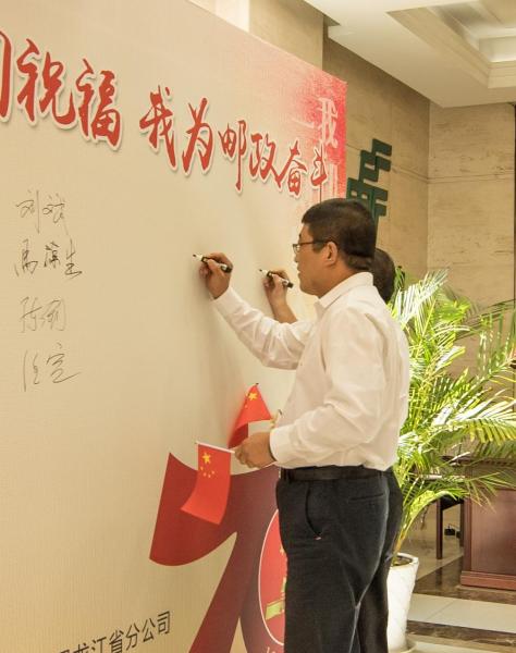9月26日下午,省邮政工会在省分公司本部一楼大厅组织开展了“我为祖国祝福 我为邮政奋斗”签字仪式。省分公司党组成员、省分公司寄递事业部班子成员、机关各部室、直属单位负责人及各部门干部职工代表,在“我为祖国祝福 我为邮政奋斗”的背景墙上进行了签字祝福。机关干部职工纷纷手举小国旗、祝福牌在照片墙和签字墙前合影留念。以此记录下龙江邮政人对祖国70华诞的深情祝福,传递爱国热情,留下珍贵记忆,向祖国母亲70年华诞献礼。