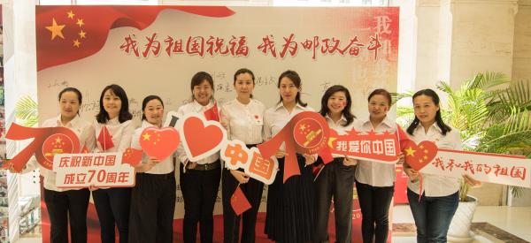 为热烈庆祝中华人民共和国成立70周年,省分公司、省邮政工会在全省范围内组织开展了“同唱一首歌,龙邮心向党”微视频活动和“我和国旗同框 我与邮政同行”摄影活动,并在省分公司大厅将“我和我的祖国”微视频进行了展播,并将先期收集的照片制作照片墙在大厅内进行了集中展示。