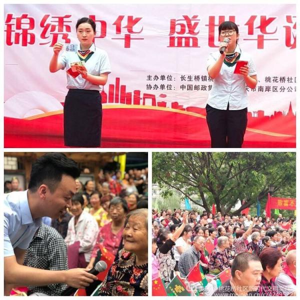 为庆祝祖国母亲70岁生日,弘扬中华民族敬老、爱老、助老的传统美德,丰富广大人民群众文化娱乐生活,中邮重庆市南岸区分公司长生桥支局联合桃花桥社区在富翔广场举行“锦绣中华,盛世华诞”庆祝建国70周年文艺演出。