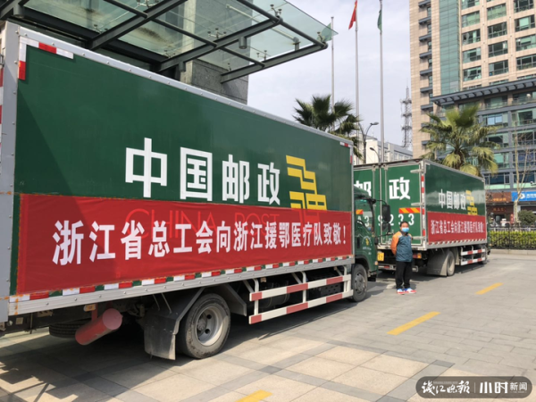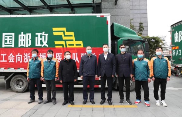 在仪式结束后,装满了省总工会价值200余万元慰问品的4辆邮政专车,立即从浙江省邮政公司大楼出发开往湖北,将尽快发放给医疗队队员。(浙江邮政工会)