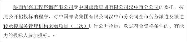 一、招标项目名称:中国邮政集团有限公司汉中市分公司全市劳务派遣及派遣转承揽服务管理机构采购项目(二次)