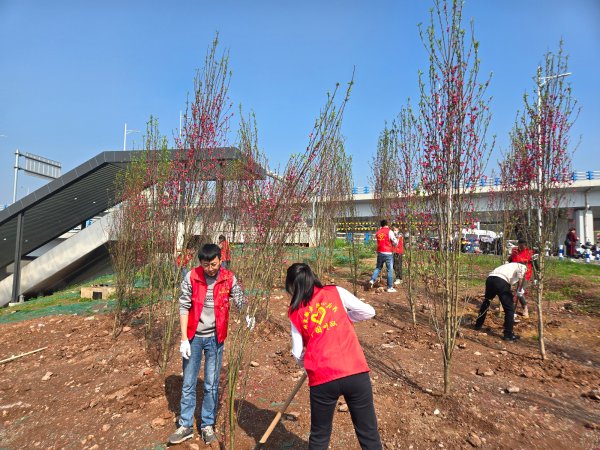 植树现场,大家分工协作,二人一组,挥锹铲土、干劲十足,挖坑、填土、培土、浇水,每一个环节井井有条,一派热火朝天的劳动景象,齐心协力将50棵桃树苗栽入土中。强化日常养护,“种”好更要“活”好,巴南分公司在见缝插绿、增添绿景的同时,安排专人负责后续浇水养护、定期查看,确保苗木成活率。此次活动用实际行动践行绿色邮政发展理念、参与国土绿化美化,为美丽城市增添新绿,营造新时代全民共建共享生态文明的浓厚氛围!