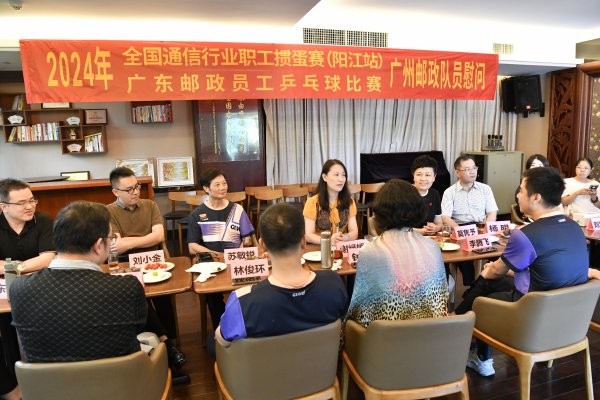 6月27日上午,慰问活动在广州市分公司青年活动室进行。省邮政工会基层工作部副部长谢绿媛,广州市分公司副总经理、工会主席莫隽予,工会副主席杨明出席活动。8名乒乓球参赛员工与4名掼蛋参赛员工依次发言,畅谈参赛感悟。