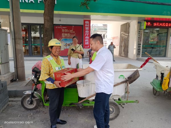 在钟祥邮政“邮爱驿站”内,宽敞明亮的休息区凉意袭人,配备齐全的防暑物资摆放有序。7月28日上午,20余名户外工作者齐聚驿站,参加“夏送清凉”专题活动。钟祥市邮政工会主席张晓华亲自为到场的环卫工人、外卖骑手等送上清凉大礼包,内含解暑饮品、防暑药品等实用物资。“大家在坚守岗位的同时,一定要注意防暑降温,确保作业安全。”张晓华的暖心叮嘱让在场户外劳动者们倍感温馨。