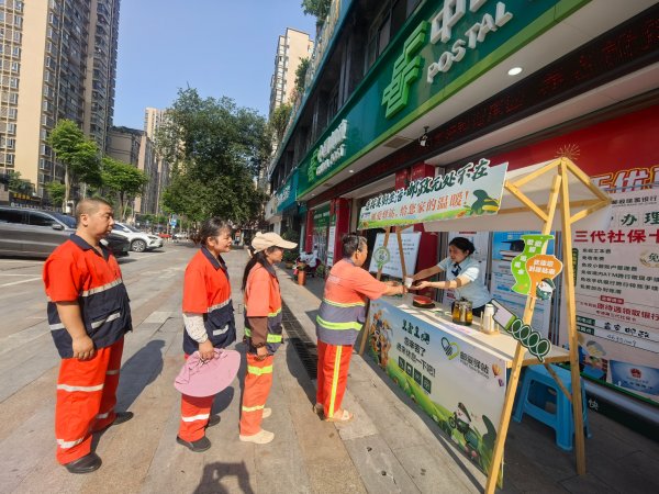 8月15日,荣昌邮政工会组织开展“邮爱驿站送清凉,真情服务暖人心”活动。总经理朱军带队为环卫工、快递员、外卖人员、交巡警等户外劳动者送去防暑物资,用实际行动为酷暑中的坚守者撑起 “遮阳伞”。