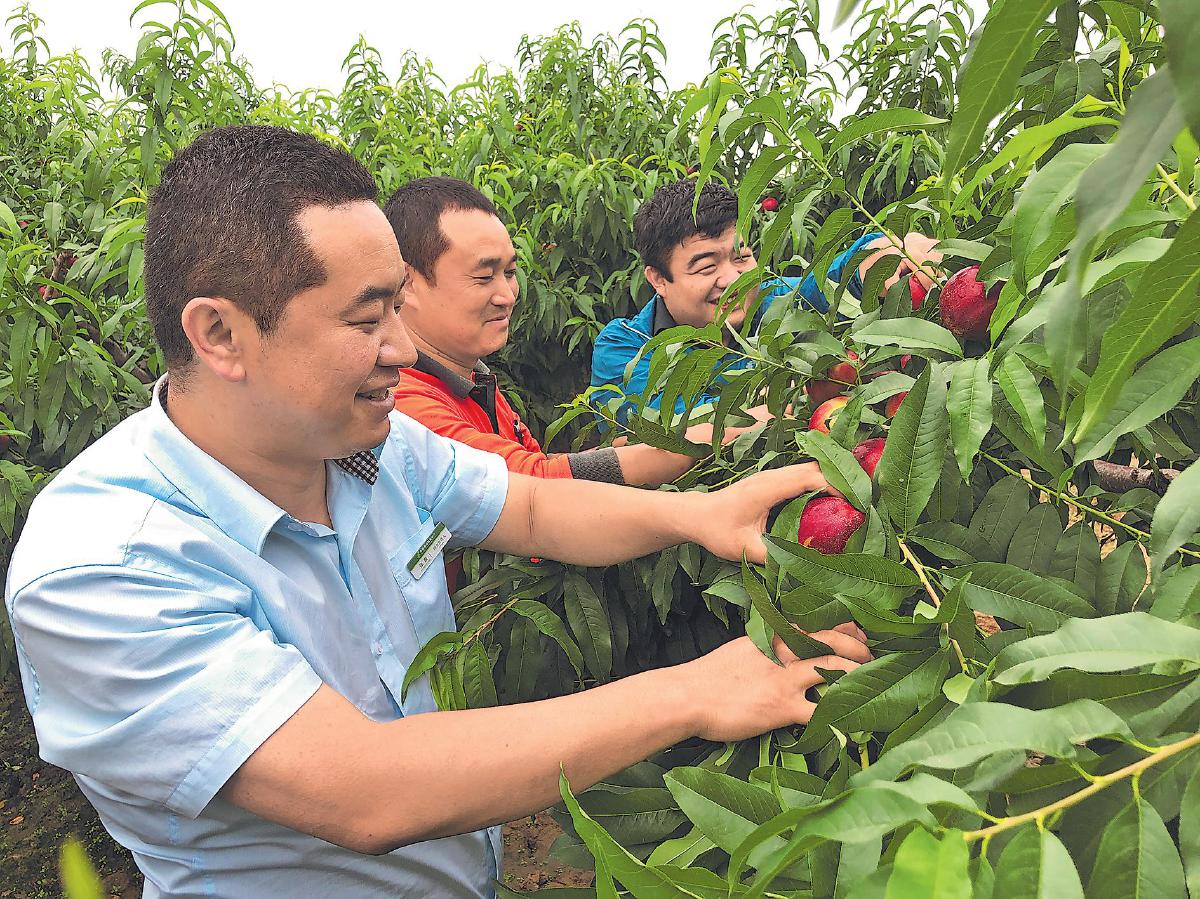 在天水市秦州区中梁镇三湾村,邮政工作人员帮果农采摘花牛苹果。