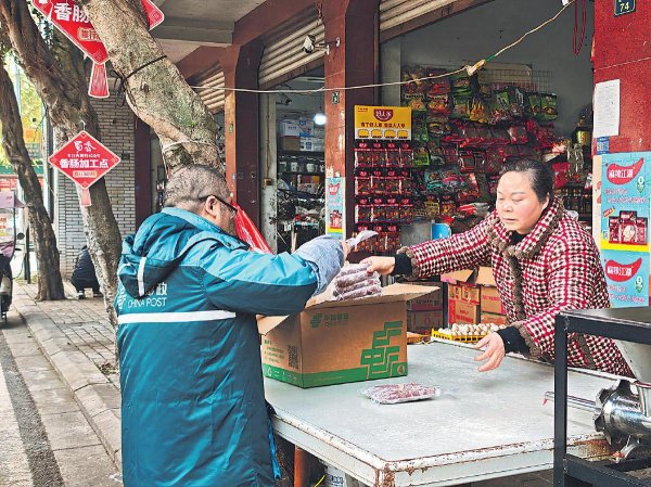1月14日,四川省金堂县云合镇的副食店前,土桥邮政支局工作人员接过商户刚打包好的腊肉香肠,准备寄往远方。 □黄超 摄