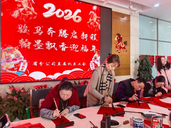 岁序更替,华章日新。为喜迎2026农历马年新春,丰富广大职工精神文化生活,传递工会“娘家人”的温暖关怀,营造喜庆祥和、昂扬奋进的节日氛围,2月11日,省分公司直属机关工会精心举办“骏马奔腾 新年迎福”迎春文化活动,以笔墨传福、以文体聚力,让浓浓年味与工会温情充盈职工心间。