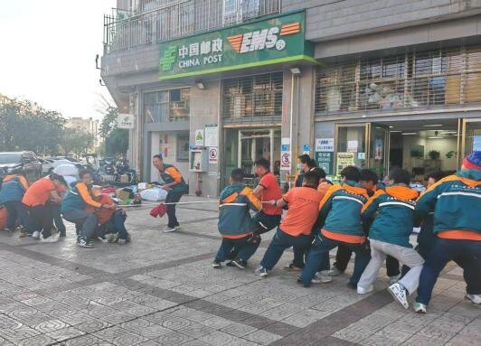 本次春日活力赛设置了EMS信封接力与力拔山河拔河两大特色项目,既贴合邮政工作场景,又充满竞技趣味。在EMS信封接力环节,职工们手持EMS信封,沿着指定路线快速折返传递,大家步伐矫健、配合默契,在保证道具平稳传递的同时,拼速度、比协作,充分展现了邮政人高效利落的工作作风;拔河比赛更是将现场氛围推向高潮,随着哨声响起,两组队员紧握长绳、重心后倾,“一二、一二”的号子声铿锵有力,场外职工自发组成啦啦队,呐喊助威声此起彼伏,大家心往一处想、劲往一处使,在拉锯比拼中凝聚起强大的团队合力。