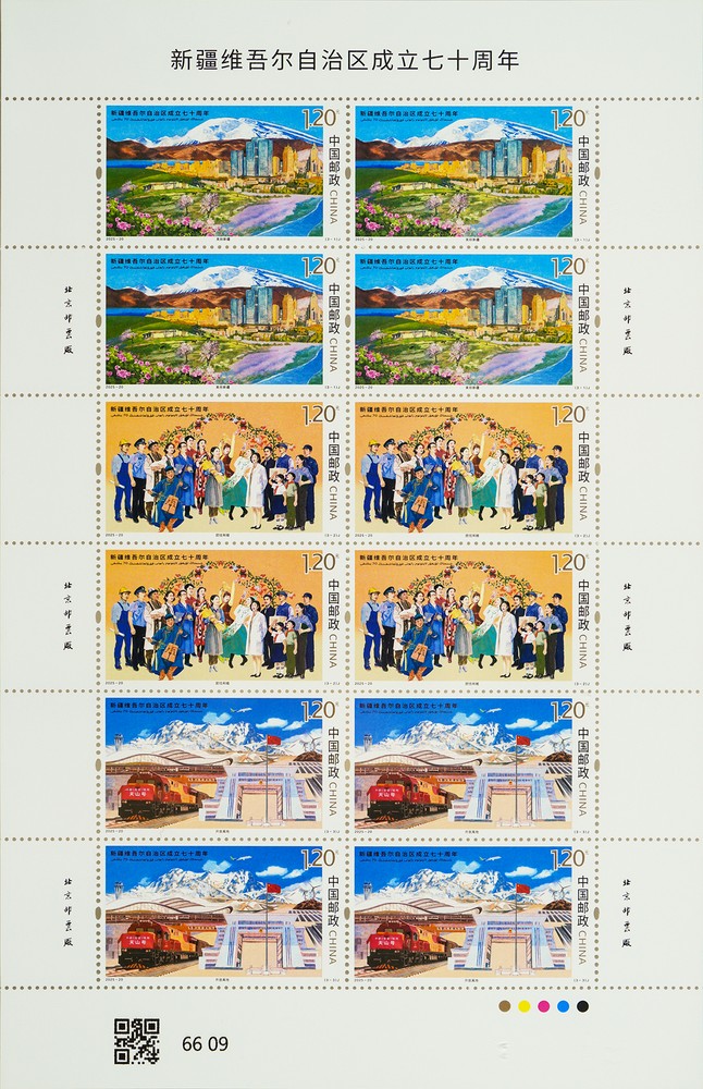 中国邮政定于2025年9月21日发行《新疆维吾尔自治区成立七十周年》纪念邮票1套3枚。详情如下: