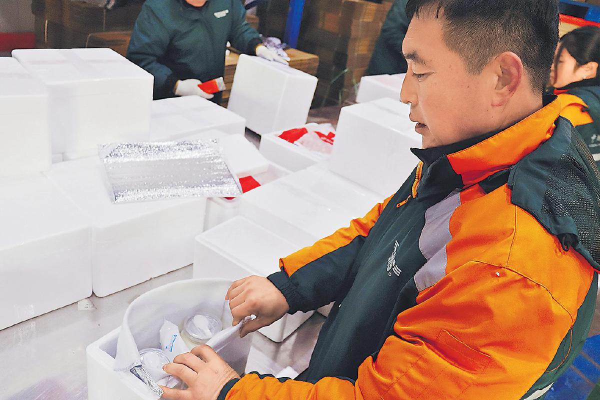 邮政工作人员在打包“极速鲜”邮件。 □卜媛媛 摄