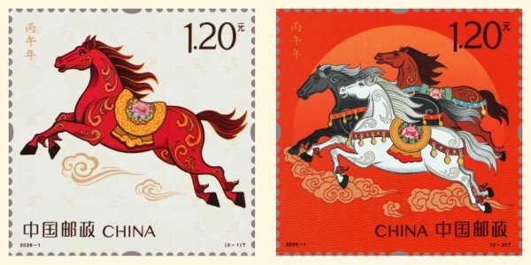 《丙午年》特种邮票全套共2枚。第一枚图名为“驰跃宏图”,图中红马踏云、鬃毛如焰,表达了在新的一年里,对党全面领导下国家经济社会发展继续行稳致远,向着“十五五”时期主要目标接续奋进的美好期许。第二枚图名为“万骏臻福”,图中三骏并驰、祥纹环绕,象征全国各族人民凝聚磅礴合力,在全面建设社会主义现代化国家、全面推进中华民族伟大复兴征程上协力同心。
