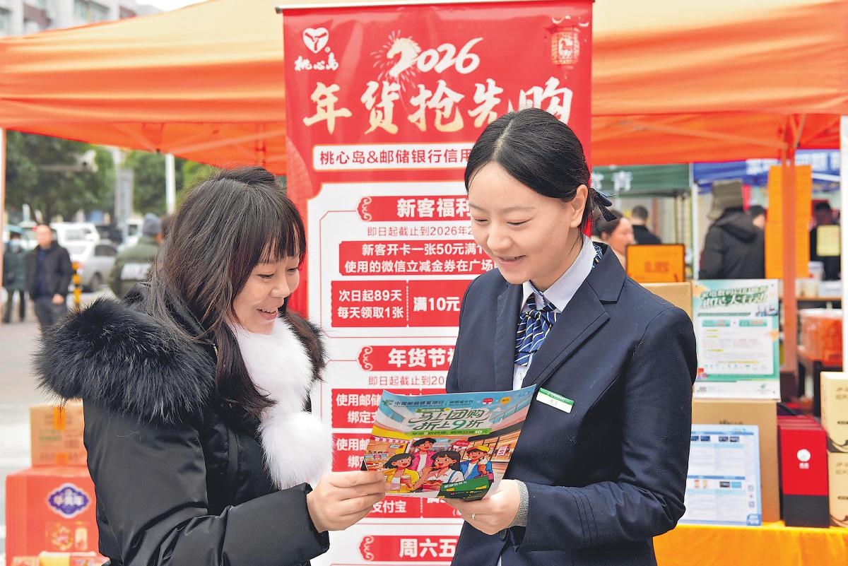1月23日,陕西省汉中市“陕亮生活 惠购汉中”新春年货购物节现场,邮储银行汉中市分行工作人员为消费者详细介绍“年货抢先购”优惠活动。该分行通过开展惠民金融宣讲、特色产品展示及互动体验等形式,为市民送上新春“金融礼包”,以金融“活水”精准支持消费市场,助力市民乐购年货、温暖迎春,有效激发地方消费活力。
