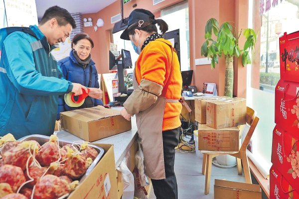 春节前夕,“土味年货”的销售与寄递进入高量期。江苏邮政积极做好收寄服务,全力保障邮件时限,自1月以来,生鲜品类邮件业务量同比增长61.9%。图为南京市邮政分公司中华门支局员工来到一家桂花鸭专卖店,为客户提供年货随买随寄服务。