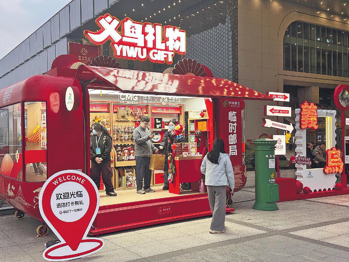 走进临时邮局,春晚元素与邮政风情撞个满怀:盖一枚春晚纪念邮戳,把时光印在纸面;投一张祝福明信片,让思念顺着邮路奔赴;逛一圈特色展销区,文创礼物异彩纷呈……在这里,每个人都能打包一份来自义乌的“春晚限定记忆”。