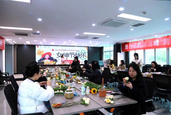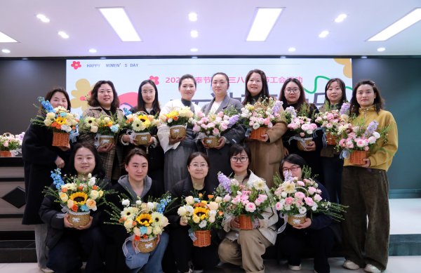 专业花艺师从花材选择、色彩搭配、造型设计等方面细致讲解插花技巧,并现场演示。实操环节中,女职工们尽情发挥创意自由创作,花艺师全程穿梭指导、答疑解惑。创作完成后,大家纷纷展示作品、分享心得,现场氛围热烈融洽,最后全体合影留念,定格温馨美好瞬间。