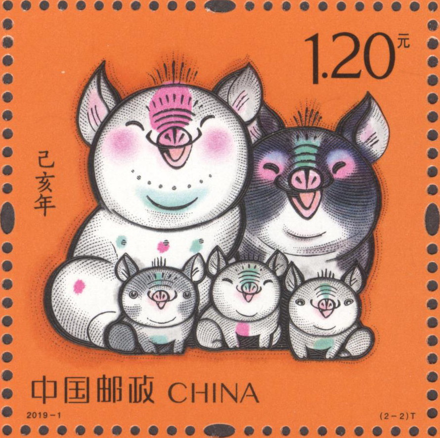 中国邮政定于2019年1月5日发行《己亥年》特种邮票1套2枚,图案名称分别为:肥猪旺福、五福齐聚,全套邮票面值2.40元。另发行小本票1本,售价12元。