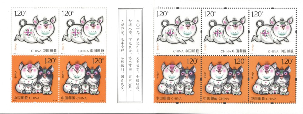 注:同时发行《己亥年》邮票版式三(整张枚数:2套4枚;整张规格:120×160毫米;对联作者:常江),用于赠送给预订2019年全年纪特邮票的预订户。