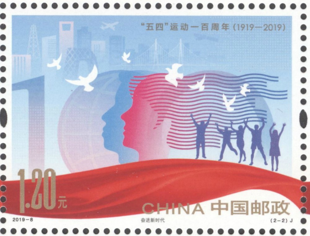 中国邮政定于2019年5月4日发行《“五四”运动一百周年》纪念邮票1套2枚,邮票图案名称分别为:传承“五四”精神、奋进新时代,全套邮票面值为2.40元。