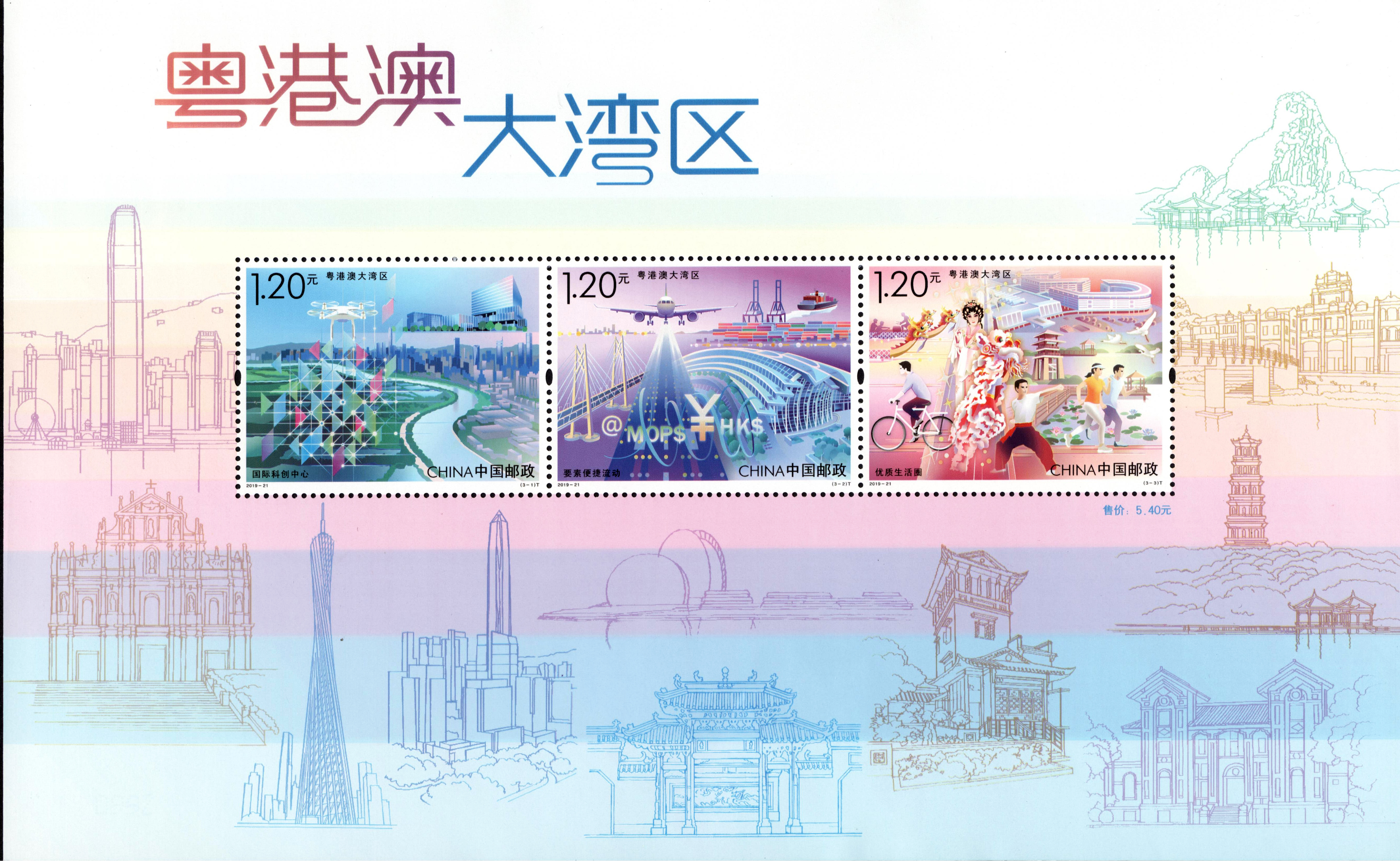 中国邮政定于2019年9月26日发行《粤港澳大湾区》特种邮票1套3枚,邮票图案名称分别为:国际科创中心、要素便捷流动、优质生活圈。全套邮票面值为3.60元。另发行小全张1枚,售价5.40元。