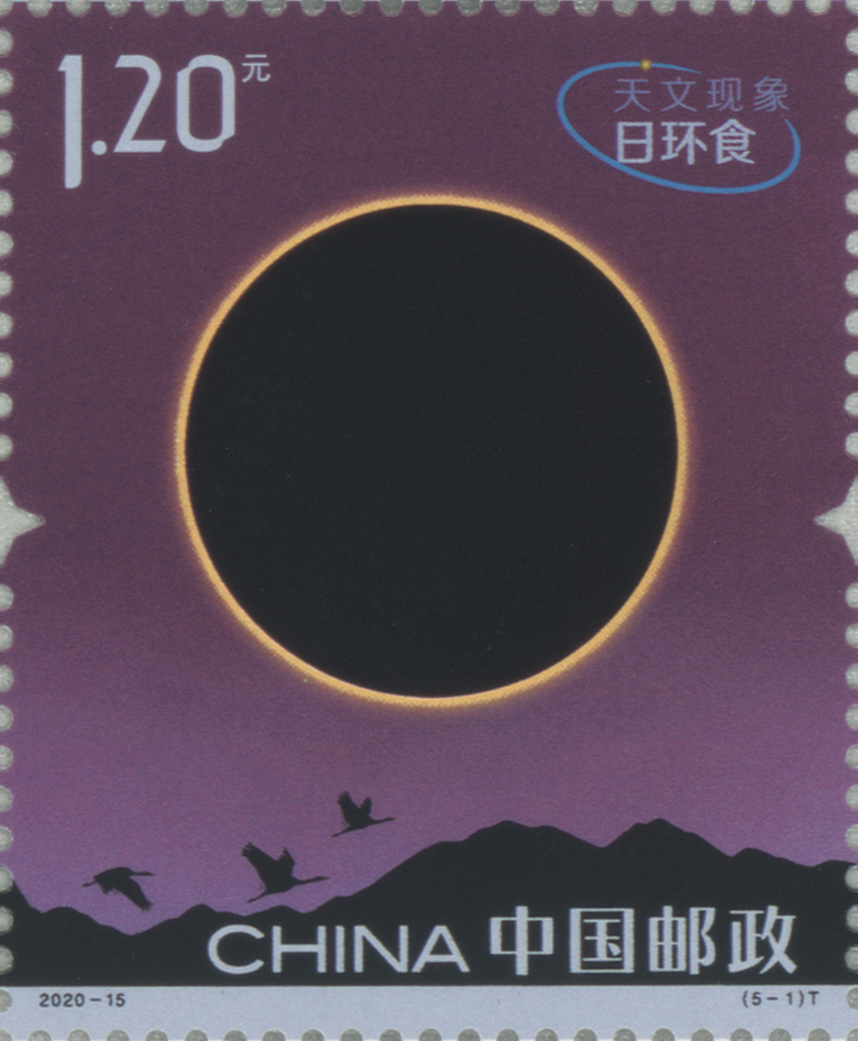 中国邮政定于2020年6月21日发行《天文现象》特种邮票一套5枚。全套面值6.60元。计划发行量为830万套。
