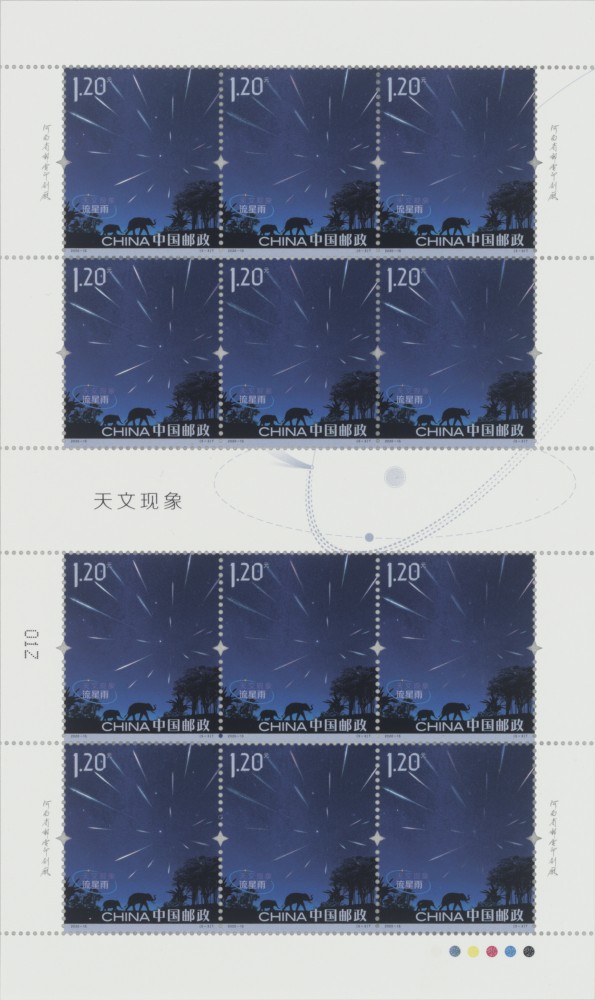 星际空间的微细尘埃以高速闯进大气层,与大气分子磨擦生热而产生白炽光形成流星,流星划过天空会出现的一条短暂的亮带。邮票第三枚“流星雨”以对冲的角度再现绚丽的流星雨场面。