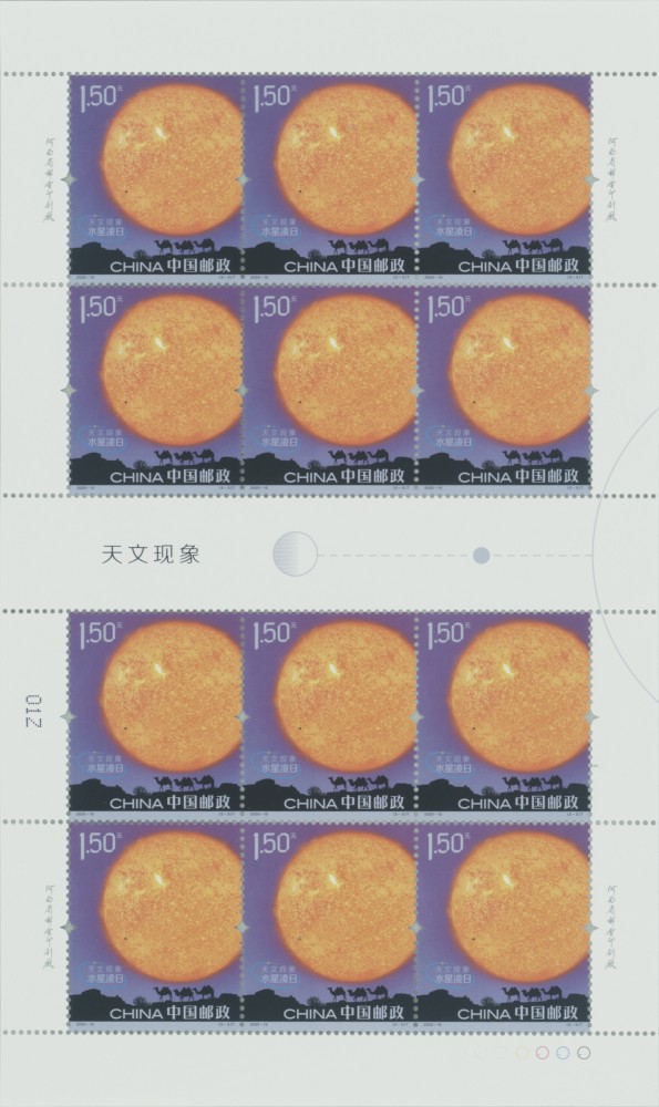 水星运行至地球和太阳之间,三者连成直线,太阳投射的光线被水星挡住。从地球观测,太阳上形成一个小黑点,即为“水星凌日”现象。邮票第五枚“水星凌日”以望远镜的视角观测水星黑影,再现水星掠过太阳的过程。