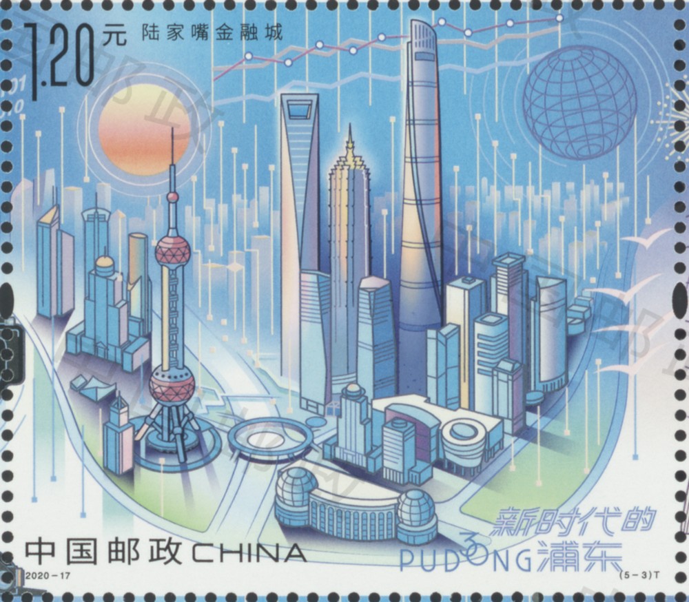 中国邮政定于2020年7月20日发行《新时代的浦东》特种邮票一套5枚,全套邮票面值为6.00元,邮票计划发行量660万套。5枚邮票名称分别为:中国(上海)自由贸易试验区、张江科学城、陆家嘴金融城、浦江东岸、洋山港。