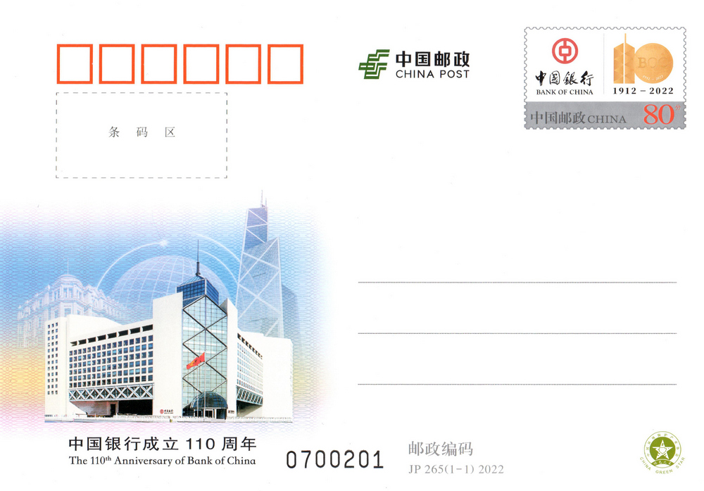 中国邮政定于2022年1月28日发行《中国银行成立110周年》纪念邮资明信片1套1枚。详情如下:
