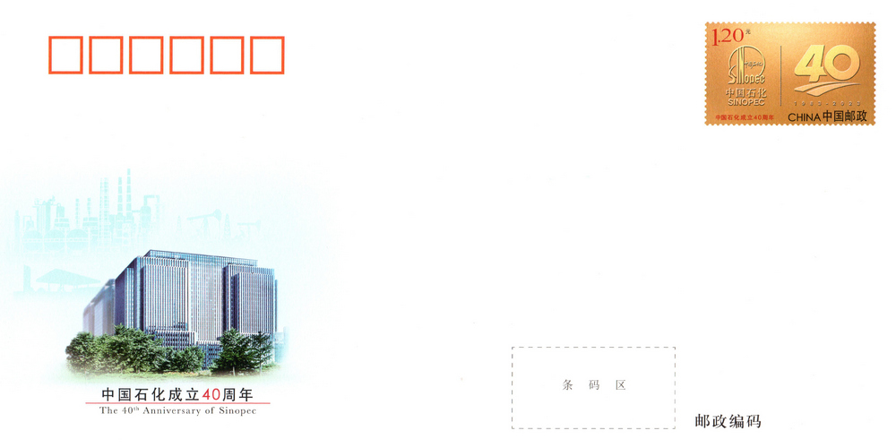 中国邮政定于2023年7月12日发行《中国石化成立40周年》纪念邮资信封1套1枚。详情如下: