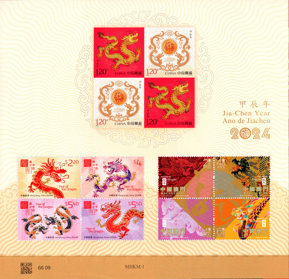 另与香港邮政、澳门邮电共同印制同题材三地小全张1枚,内含中国邮政邮票4枚(2套,无齿孔),香港邮政、澳门邮电邮票各4枚。小全张编号:MHKM-1。成品规格:206×200毫米。版别:胶雕套印(采用局部烫印工艺)。印制厂:河南省邮电科技有限公司。邮折售价:人民币52元。计划发行数量:60万枚(不含港澳地区)。