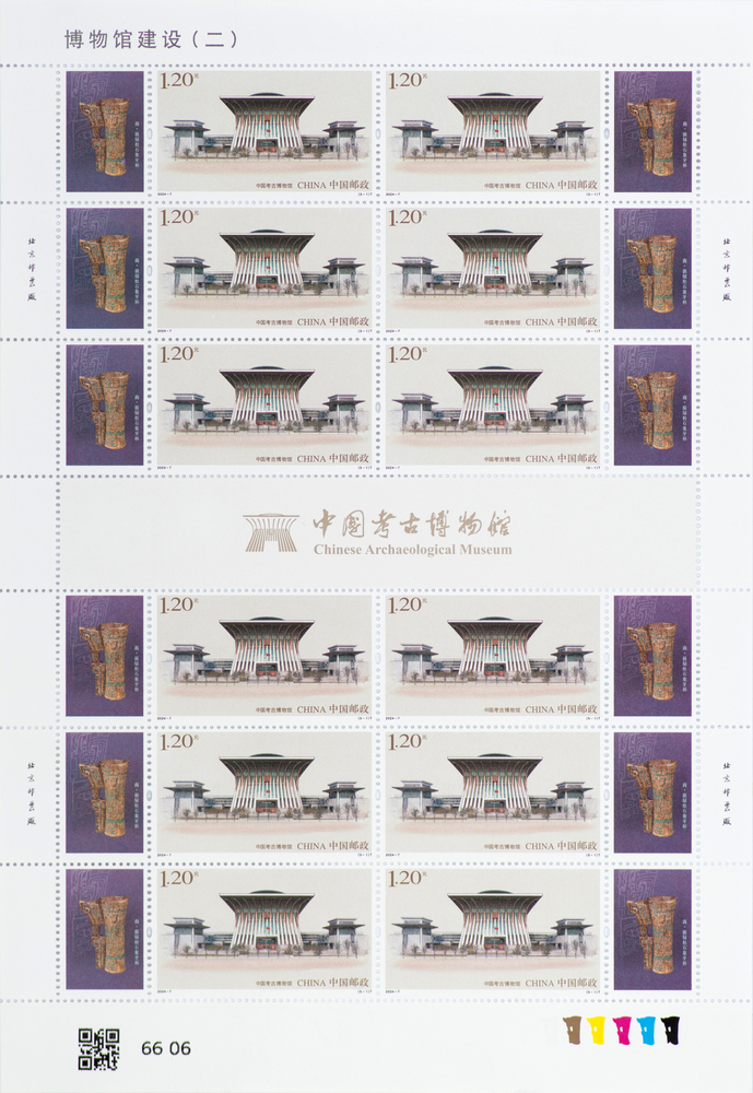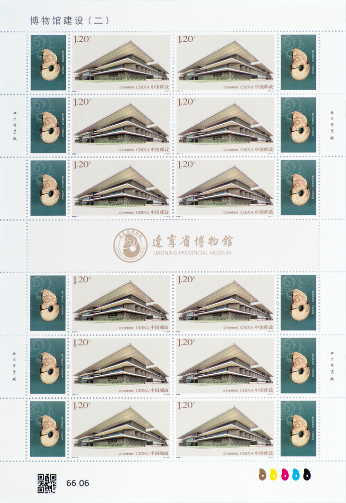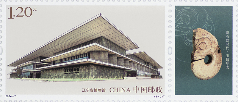 该套邮票采用主附票设计形式。主票体现了5座博物馆建筑特色,简洁雅致的色彩、清晰有力的线条,彰显出稳定而极富张力的建筑美感;附票为各馆推荐的重要文物,展现出我国灿烂的传统文化和悠久的历史传承。第一枚中国考古博物馆是由中国历史研究院建立的国内第一家以考古命名的国家级专业博物馆。该馆以“历史中国,鼎铸文明”为主题,以“仓储式陈列,沉浸式体验”为特色,集展览展示、收藏保护、学术研究、宣传教育为一体。附票表现商代嵌绿松石象牙杯,为商晚期牙雕,1976年在河南省安阳市殷墟妇好墓出土,被列入《首批禁止出国(境) 展览文物目录》。第二枚辽宁省博物馆是一座现代化的大型综合历史与艺术类博物馆,其前身为1949年创建的东北博物馆,是新中国建立的第一座博物馆,1959年改称辽宁省博物馆。附票表现新石器时代玉玦形龙,为目前已知红山文化玦形玉猪龙中形体较大、形制最规整的一件。第三枚湖北省博物馆是国家一级博物馆,馆藏文物体系完整、数量丰富、质量精湛、地域特色鲜明,在国内外享有盛誉。附票表现元代青花四爱图梅瓶,梅瓶腹部分别绘王羲之爱兰图,陶渊明爱菊图,周敦颐爱莲图,林和靖爱梅、鹤图。第四枚湖南博物院是湖南省最大的历史艺术类博物馆,是首批国家一级博物馆,馆藏文物中尤以马王堆汉墓出土文物、商周青铜器、楚文物、历代陶瓷、书画和近现代文物等最具特色。附票表现商代皿方罍,该皿方罍器型硕大,雄浑庄重,雕刻精美,富丽堂皇,是中国晚商青铜器鼎盛时期的代表之作,充分反映了中国青铜器铸造的高超技艺和摄人心魄的气势。第五枚三星堆博物馆,其新馆对标世界一流博物馆建设,是目前西南地区最大的遗址类博物馆单体建筑。馆内文物生动揭示出古蜀文明的灿烂辉煌,彰显着中华文化永久魅力和时代风采。附票表现商代铜扭头跪坐人像,从造型、纹饰等方面来说都是三星堆考古全新的发现,对研究三星堆的青铜铸造技术及艺术、宗教信仰与社会体系、与周边地区的文化交流具有重要意义。