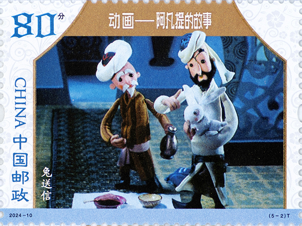 中国邮政定于2024年6月1日发行《动画——阿凡提的故事》特种邮票1套5枚,邮票图案名称为卖树荫、兔送信、神医、宝驴、种金子。全套邮票面值5.20元。邮票计划发行数量为580万套。