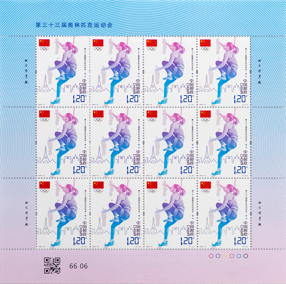 第三十三届奥林匹克运动会将于法国巴黎当地时间2024年7月26日开幕,8月11日闭幕。这是整整一个世纪后,奥运会重回巴黎,法国首都将成为继伦敦之后第二座三次举办夏奥会的城市。该套邮票采用简约、概括的图形化设计方式,展现出两项运动的精彩瞬间。邮票第1枚表现了男子自由泳的形象,画面采用从水中仰视的角度,展现运动员劈波斩浪、奋力向前的姿态;第2枚表现了女子速度攀岩的形象,画面采用斜侧视角,展现运动员抬腿踩点、向上攀拉的动作。两枚邮票画面背景表现了埃菲尔铁塔等巴黎城市建筑,体现出本届奥运会的地域特色。邮票结合高精度胶版印刷工艺,整体画面色彩明亮充满活力,边饰渐变过度自然,同时辅以局部烫印工艺,点亮主题背景,增强画面动感。
